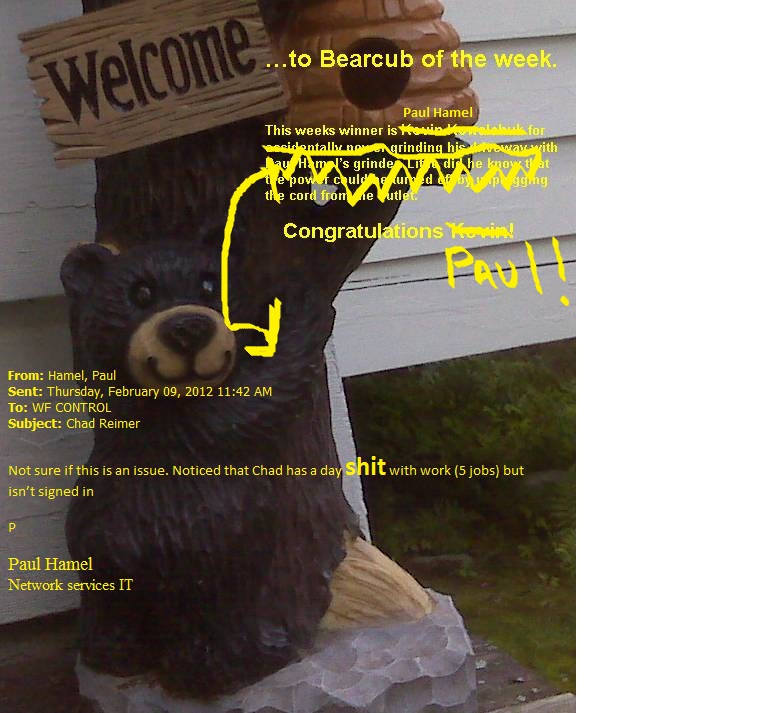 | May/2012 | [Emil] Before I forget – Paul Hamel gets the coveted Bear Cub of the Week award for forwarding his phone to a non existent number. Imagine how his distraught clients felt when they couldn’t reach him OR leave a message when they called. |